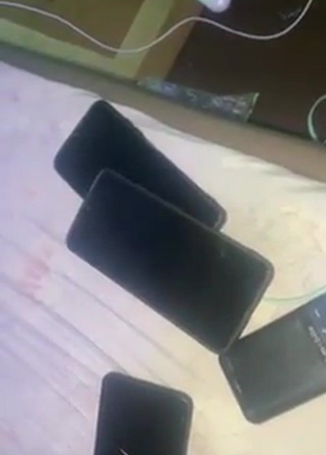 The video depicts a close-up, high-angle shot of a bed covered with a white sheet that appears somewhat soiled. Four black smartphones are scattered across the sheet, their screens facing up. One of the phones has a visible crack in its screen. At the top of the frame, partially obscured by the edge of the bed, there's a white phone charger, a pair of white earbuds, and some scattered cords. The lighting is dim, casting shadows across the scene, and the overall impression is one of disorder.