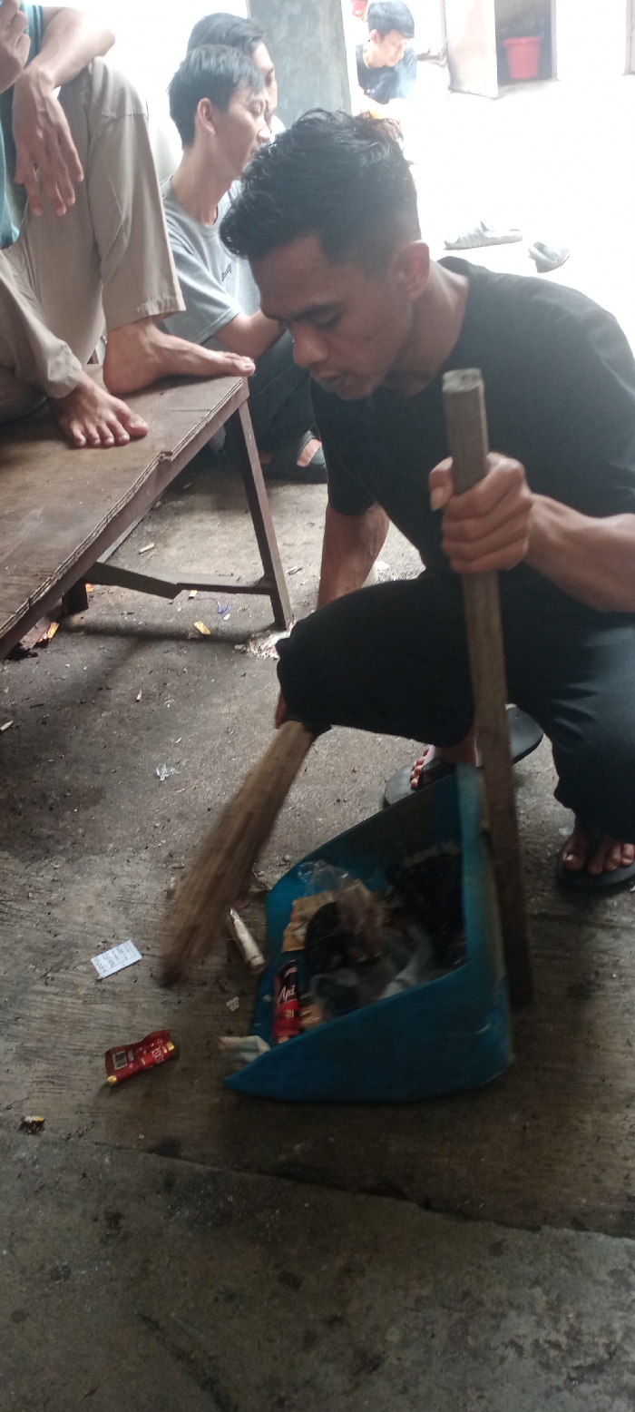 A male individual in Cilampeni, Indonesia, is captured in a crouched position, actively sweeping debris into a blue plastic dustpan on a concrete floor