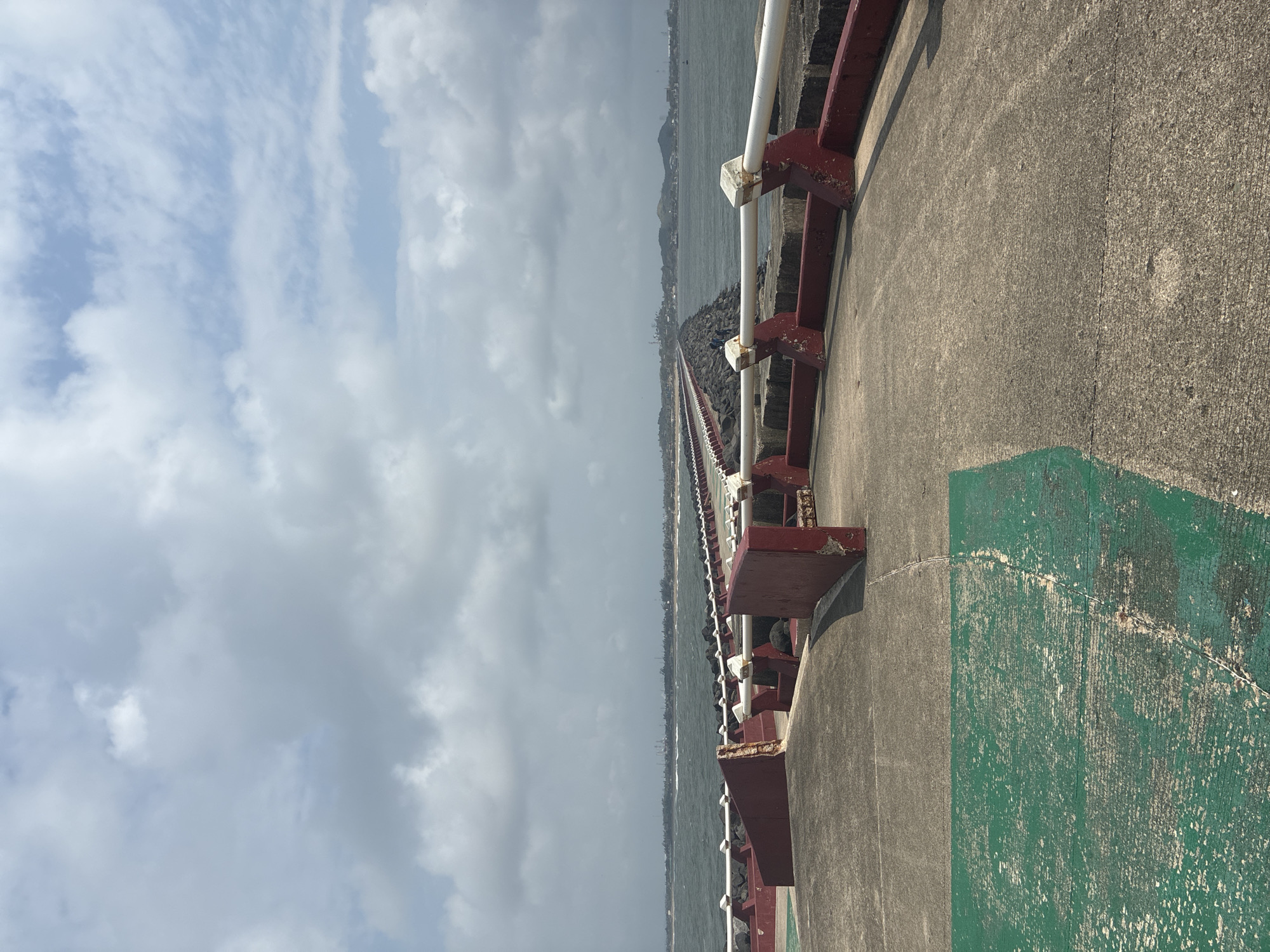 The image depicts a pathway or bridge with a red and white railing. The railing runs along the right side of the pathway and extends into the distance. The pathway itself is made of concrete and has a painted green section on the right. Beyond the railing, there is a body of water with land visible in the distance. The sky is cloudy with patches of blue. The location is likely Allende, Mexico based on the provided context.