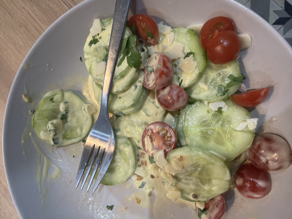 A plate features a salad of sliced cucumbers and halved cherry tomatoes, coated in a creamy dressing with herbs and parmesan shavings. A silver fork rests atop the salad. The dish is presented on a gray plate, which shows evidence of some of the food having been consumed. The background shows hints of a wooden table and a tiled surface.