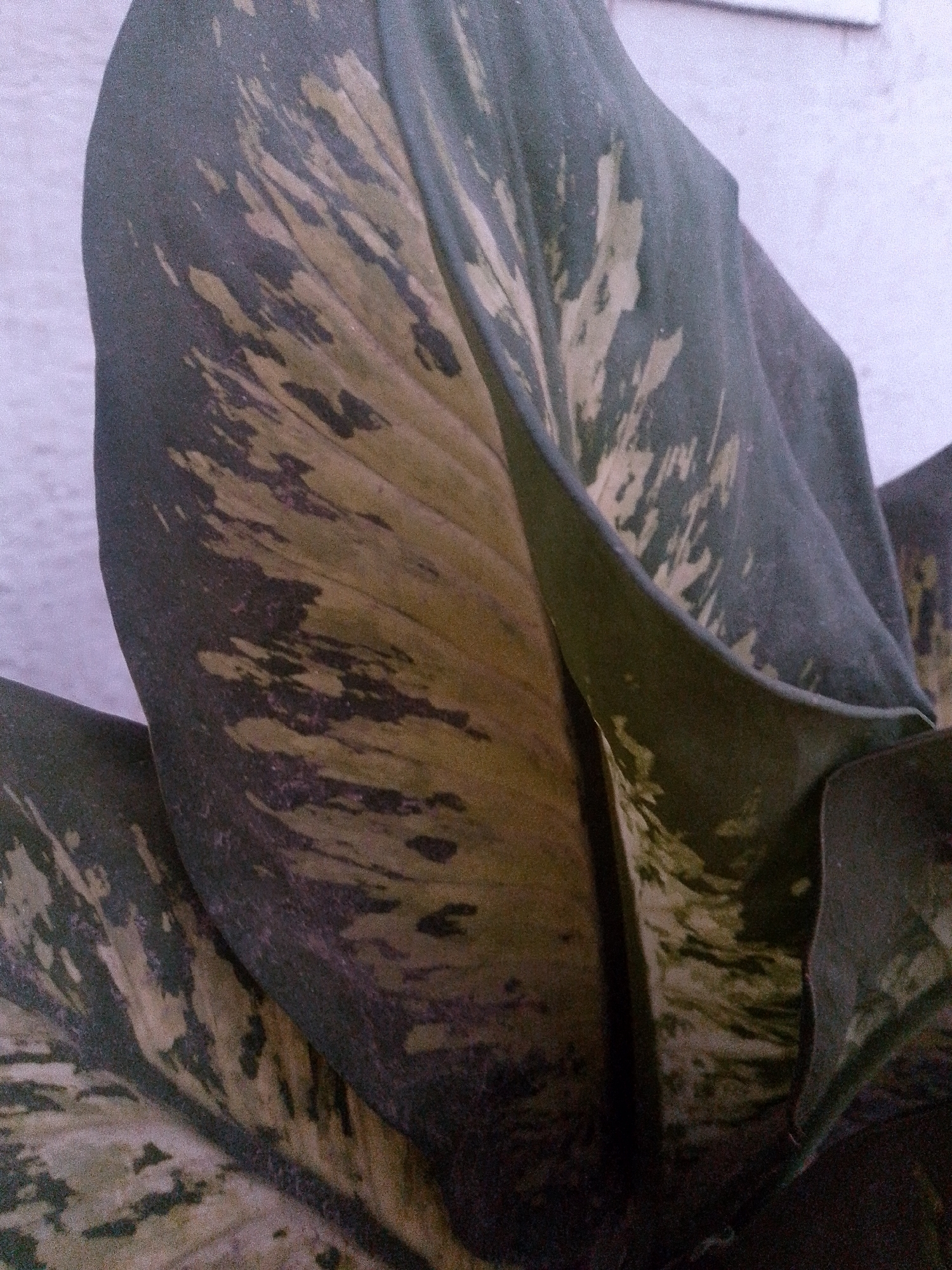 - "A close-up shot reveals the leaves of a Dieffenbachia plant, exhibiting a mottled pattern of dark green, tan, and cream" by FM-JFdun1, licensed under CC BY 4.0