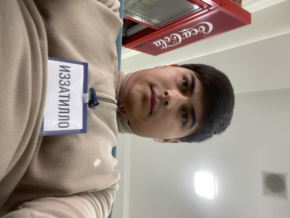 This image depicts an indoor scene in Chinabad, Uzbekistan, focusing on a male individual from the chest up. The man has dark hair and a neutral expression, looking directly at the camera. He is wearing a beige ribbed turtleneck sweater with a quarter-zip collar. An identification badge, featuring a blue frame and the Cyrillic text "ИЗЗАТИЛЛО" in white, is clipped to his sweater. To the upper left, a red Coca-Cola branded refrigerator or cooler is partially visible. The background consists of light-colored walls and a ceiling, where an illuminated square recessed light fixture and a dark square ceiling grille (consistent with a speaker or vent) are present. A segment of a blue object, possibly part of seating, is discernible behind the subject's left shoulder.
