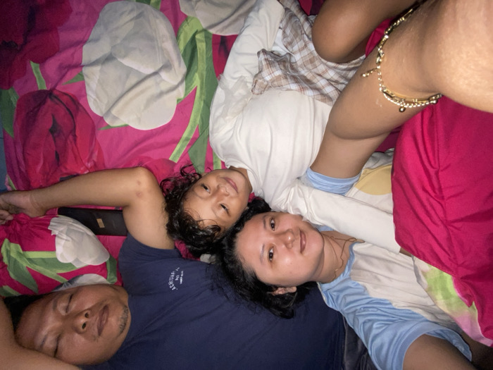 - "An overhead view depicts three individuals lying supine on a bed adorned with a pink floral patterned duvet cover in Gelam, Indonesia" by FM-htxI33, licensed under CC BY 4.0