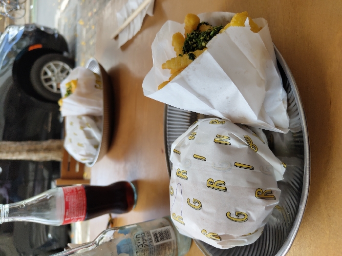 The scene depicts a close-up view of a meal served outdoors on a light brown wooden table in Tel-Aviv, Israel. In the foreground, a ribbed metallic plate holds a burger wrapped in white paper, featuring repeated yellow "GRING" lettering. Adjacent to the burger, also on the plate, is a serving of golden French fries contained in a white paper wrapper, topped with a dark green, finely chopped garnish. To the left of the plate, a partially visible clear glass bottle with a white label displays Hebrew text, including "חייב בפיקדון" (subject to deposit). Further back on the table, another ribbed metallic plate contains two additional food items wrapped in white paper, one also displaying "GRING" lettering. A glass bottle containing a dark brown liquid, consistent with Coca-Cola, with a red and white label, stands near these items. To the right, two white chopsticks rest on white paper. The blurred background reveals a dark vehicle, a tree trunk, and a sidewalk, indicating a street-side dining environment. No individuals are visible.