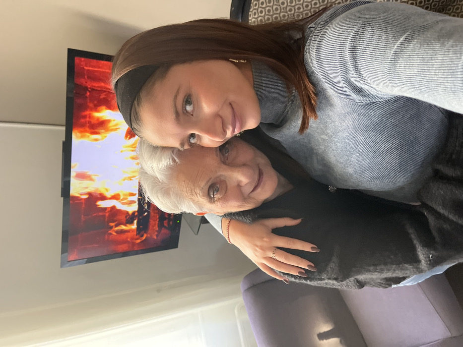The image depicts two females in an indoor setting, identified as Marseille, France. An elderly woman with short gray hair and a dark, possibly black, sweater is positioned to the left. Her left arm is around the shoulder of a younger woman with brown hair, wearing a black headband, a light blue ribbed turtleneck sweater, and a ring on her left ring finger. Both individuals are looking towards the camera, with the younger woman appearing to hold the device, taking a selfie. In the background, a flat-screen television displays an image of a burning fireplace. To the left, a light purple upholstered armchair and sheer white curtains are visible. The wall behind the subjects is light-colored.