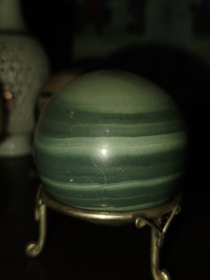A polished, spherical object, approximately 10-15 cm in diameter, is depicted resting on a four-legged metallic stand. The sphere exhibits horizontal banding in shades of green, ranging from dark teal to lighter sage, consistent with a banded mineral. A prominent white specular highlight is present on its lower-center surface, indicating a light source. Minor surface imperfections, including small pits and faint lines, are visible. The stand is constructed from a gold-toned metal, featuring scroll-like legs that curve outwards and downwards from a circular support ring. In the blurred background to the left, a light-colored, decorative object, possibly a ceramic vase with a textured or perforated surface, is partially visible. The scene is dimly lit, suggesting an indoor setting. The location is Viengkham, Laos.