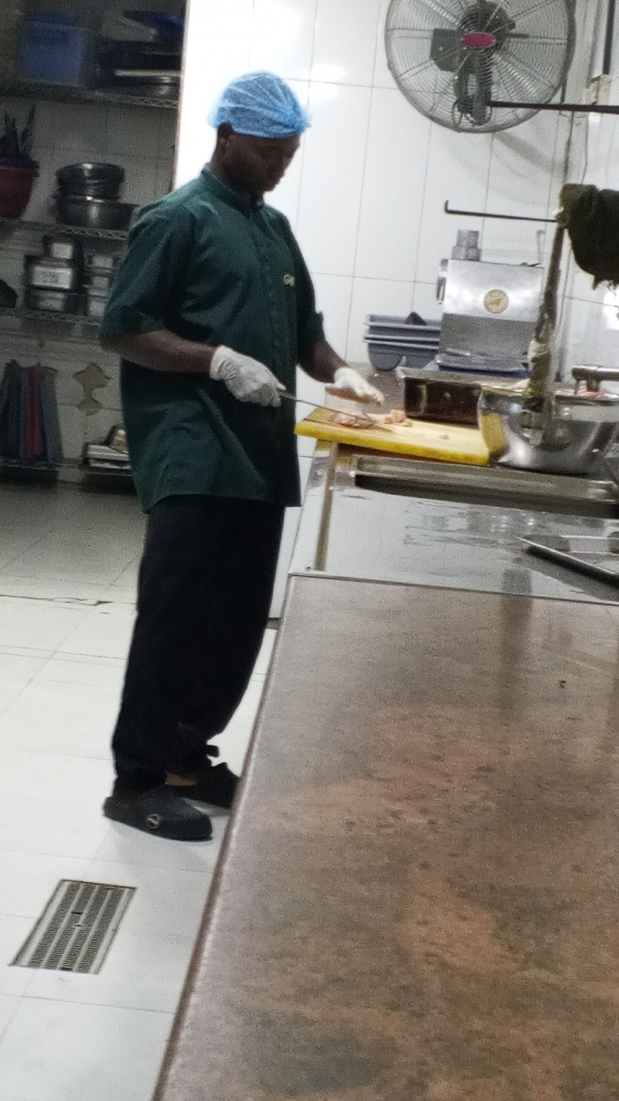 An adult male is depicted standing in a commercial kitchen setting in Giginyu, Nigeria, actively engaged in food preparation