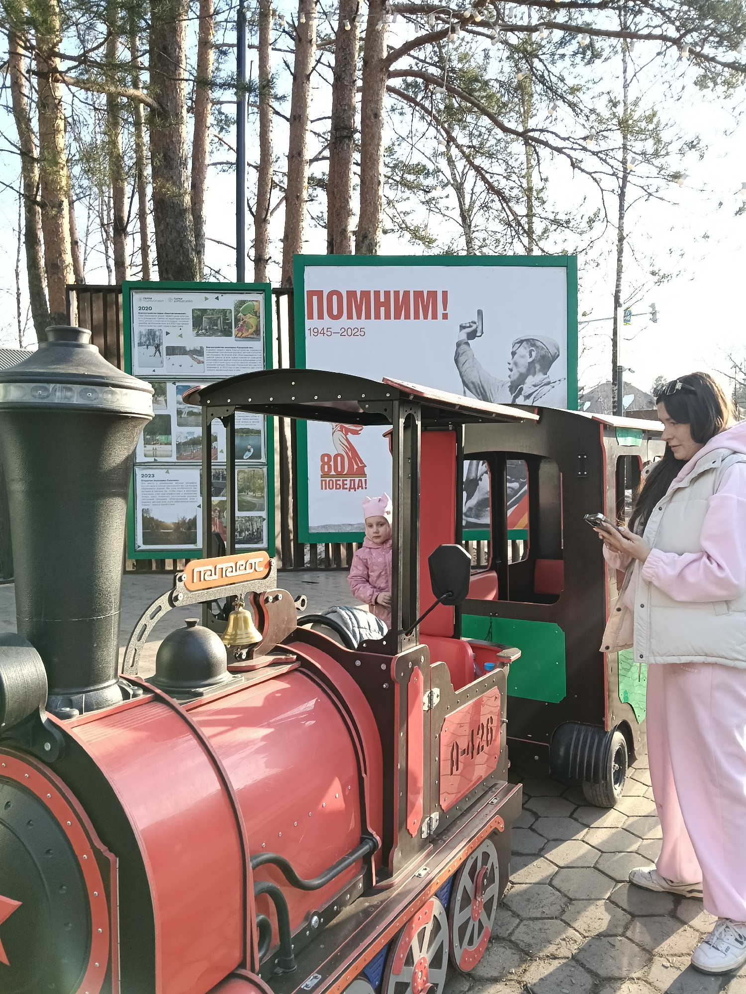 The scene is set outdoors in Yolochki Park, Domodedovo, Russia, under clear daylight, with tall conifer trees dominating the background. A red and black miniature trackless train ride is positioned on hexagonal paved ground. The train consists of a locomotive and at least one passenger car. The locomotive features a prominent red body, black chimney, a red star on its black front, and a small brass-colored bell on its fore section. A sign on the side of the locomotive displays "ПАРАВОЗ" in stylized Cyrillic. The attached passenger car has seating and the number "Д-426" on its side. A young child, wearing a pink hooded jacket and a matching pink hat with ear-like appendages, is seated in the first passenger car of the miniature train, looking towards the camera. To the right of the train, an adult female with long dark hair stands, wearing a light pink hooded sweatshirt, a cream-colored puffer vest, and light pink track pants. She is actively looking down at a smartphone, held in both hands, her attention focused on the device. Sunglasses are perched on her head. In the background, behind the train and individuals, several information boards are visible. To the left, a green-framed board, titled "ПАРК "ЁЛОЧКИ"," displays images and text detailing park improvements from 2020 and 2023. To the right, a larger green-framed billboard features the red Cyrillic text "ПОМНИМ! 1945-2025" (WE REMEMBER!) above a black-and-white image of a soldier with his arm raised, holding what appears to be a pistol or flare gun. Below this, "80 ЛЕТ ПОБЕДА!" (80 YEARS OF VICTORY!) is displayed. Overhead, string lights with small white bulbs are strung between the trees. The ground is uniformly paved with hexagonal grey tiles.