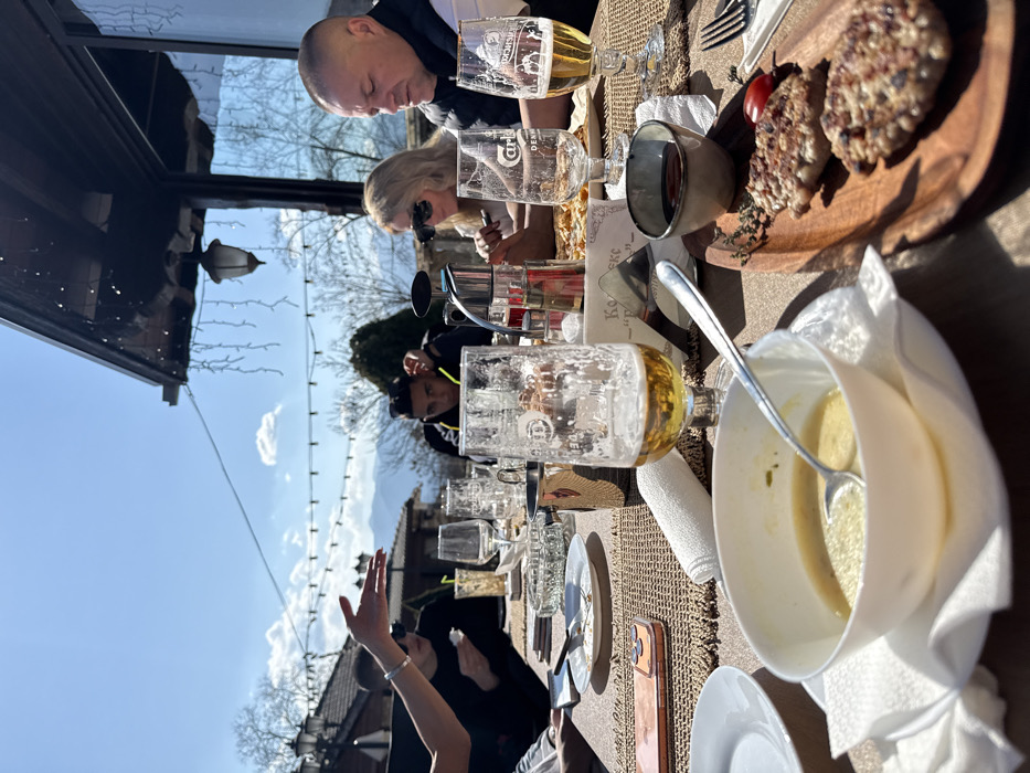 An outdoor dining scene in Baldevo, Bulgaria, is depicted on a clear, sunny day, likely during late winter or early spring, given the bare trees in the background. The foreground shows a light brown woven tablecloth covering a table laden with meal remnants. A partially empty white bowl containing a light-colored liquid and a spoon rests on a white saucer. Adjacent to it, a wooden board holds two cooked patties, a single red cherry tomato, a sprig of green herbs, and a small ceramic bowl filled with dark sauce. A beer glass, bearing a "Carlsberg" logo and containing a small amount of liquid, stands beside a rolled white napkin. Other table items include additional empty or partially full glasses, an ashtray, a smartphone in a light-colored case, a metal container, and a condiment caddy. A napkin holder with Cyrillic text is visible. Several individuals are seated around the table. From left to right: a person's arm, adorned with a silver bracelet, is raised mid-gesture. To their right, a person with dark hair and sunglasses is partially visible. Further right, a person with dark hair and a dark jacket with neon yellow accents is looking down. A blonde-haired woman wearing sunglasses is observing her plate or phone. On the far right, a man with short, buzzed hair, dressed in a dark vest over a white shirt, is looking down at his plate. The background features a dark wooden roof structure with decorative string lights and an outdoor lantern, indicating an establishment with traditional architecture. Beyond the dining area, other buildings with dark roofs are visible. The distant horizon reveals rolling hills and mountains under a bright blue sky with scattered white clouds. String lights are strung horizontally across the outdoor space.