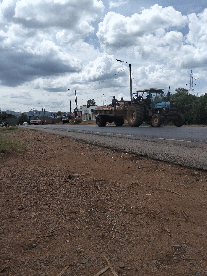 A blue tractor pulls a trailer loaded with people and cargo along a road. More vehicles are on the road in the distance. Power lines and poles line the roadside. The road's edge is dirt. The sky is overcast with heavy clouds. Trees are on the right. Buildings are in the background.