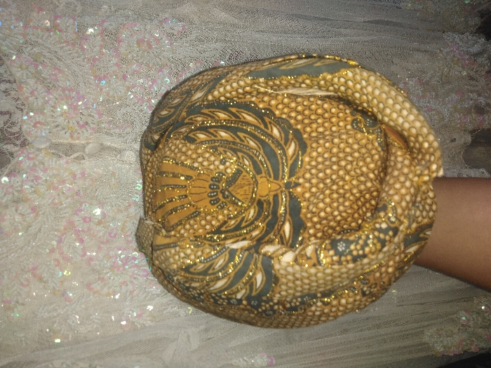 Location: Jehonville, Belgium. The image displays a traditional Indonesian head covering, likely a blangkon, positioned centrally and held upright. The fabric of the head covering is primarily golden-tan with intricate patterns in dark green-black and white. A prominent stylized bird motif, possibly a Garuda, with fanned wings and a decorative head, is centered at the top. The surrounding fabric features detailed scale-like, dot, and scroll patterns, all highlighted with golden glitter. The lower portion of a hand with brown skin is visible beneath the head covering, supporting it from below. The background consists of a white, sheer fabric adorned with numerous iridescent sequins or beads that form floral or circular patterns. This background fabric appears to be part of a garment or decorative textile.