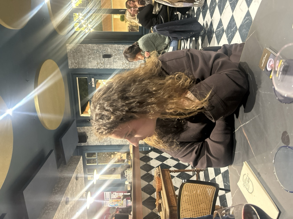 The image depicts an interior scene at the restaurant "La Maison" located at 12 Rue des Martyrs de Vingré, Saint-Étienne, France. A woman with long, wavy, light brown hair is positioned in the mid-ground, observed in profile, looking towards the left. She is wearing a dark brown long-sleeved top and has her hands resting on a dark grey, possibly marble, table. On the table, a glass containing red wine, a folded white menu with "LA MAISON" printed on it, and a pack of "Vogue" cigarettes are present, partially obscured by another glass. The establishment's interior includes a bar area on the left with a lower black and white diamond-patterned tiled section and a light wood counter. A basket of bread, various glasses, and beverage equipment are visible on the bar. The walls are covered with patterned, light-toned wallpaper. The ceiling is dark blue or teal, adorned with gold circular and rectangular decorative panels. Multiple bright overhead lights create prominent lens flares within the frame. In the background on the right, additional patrons are seated. One individual with dark hair wears a green sweater, and two other women are visible further right. The floor throughout the visible area features a black and white diamond-patterned tile design. Large windows or glass doors reveal an illuminated exterior, indicating a nighttime setting. The scene captures a social gathering in a contemporary restaurant or bar environment.
