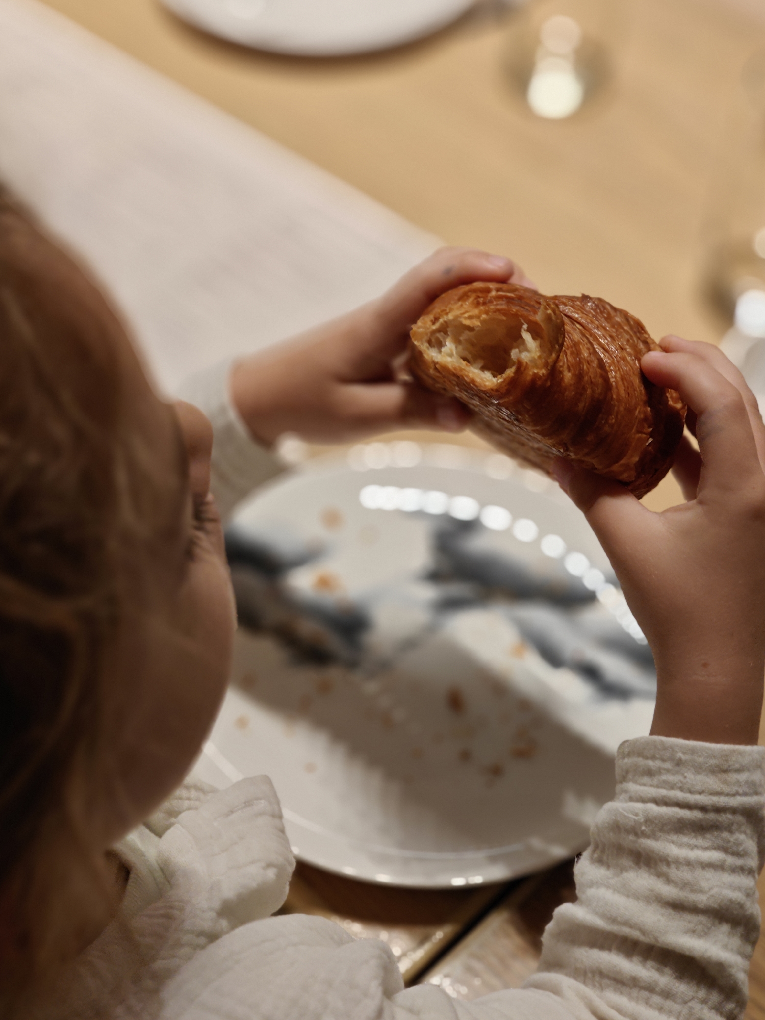 A child is holding a croissant over a plate