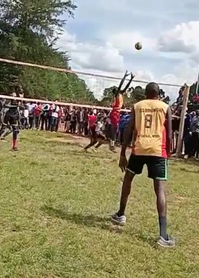 A video captures an outdoor volleyball game, likely in an open field, where a group of men are actively playing