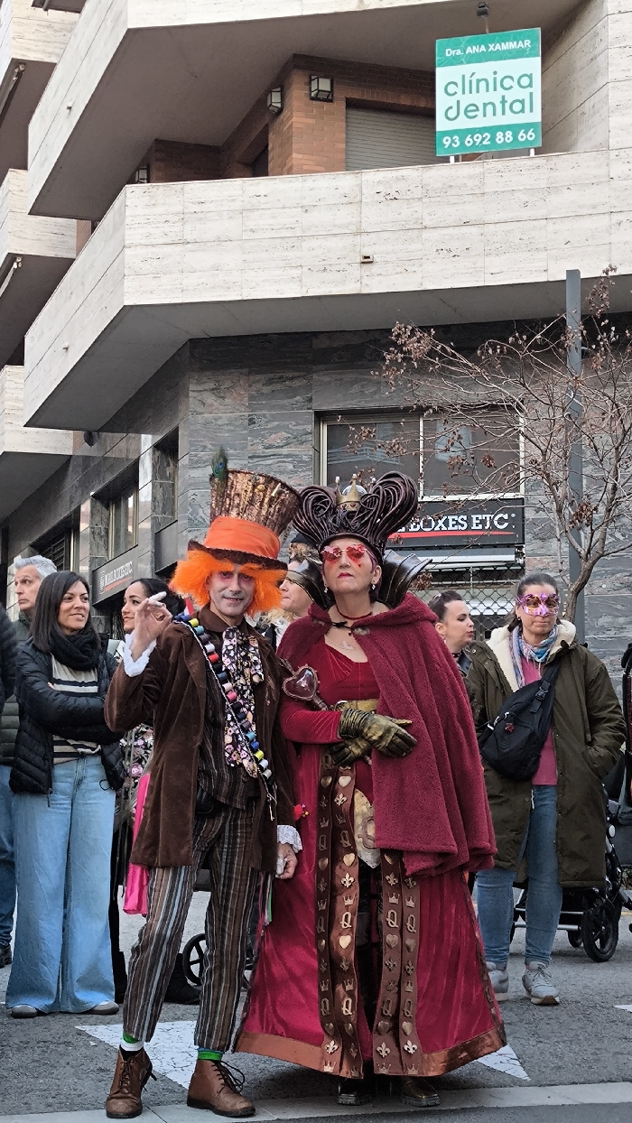 A group of people are gathered outside, including two individuals dressed as characters from Alice in Wonderland. One is dressed as the Mad Hatter, complete with an orange wig, tall hat, and colorful attire. The other is dressed as the Queen of Hearts, wearing a red dress, cape, and crown, along with heart-shaped glasses. Behind them is a building with a sign for a dental clinic. Other people are present in the background, some looking at the camera.