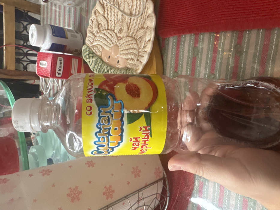 An indoor scene in Matveevskoe, Russia, captures a close-up view of a table surface with various objects. A right hand, with light skin tone, holds a clear plastic bottle containing a dark brown liquid, approximately one-quarter full. The bottle features a yellow label with Cyrillic text, reading "СУЛТАН ЧАЙ" (Sultan Tea), "СО ВКУСОМ ПЕРСИКА" (with peach flavor), and "ЧАЙ ЧЕРНЫЙ" (Black Tea), accompanied by an illustration of peaches. The bottle is capped with a white screw-top lid. To the immediate left of the bottle, a white metal napkin holder contains white paper napkins adorned with red snowflake patterns. The table surface is covered by a striped tablecloth or mat with horizontal green and white bands, and a solid red textured mat is visible on the right. In the background, from left to right, obscured plastic containers are partially visible behind the napkin holder. Further right, a red cardboard box labeled "Komfi" is present, next to a white plastic bottle with a blue label section. A light beige ceramic plate, molded with a relief design resembling a stylized bearded face (possibly Santa Claus) with textured hair or a knitted cap, rests on the table behind the main bottle. A wooden furniture element with dark metal scrollwork is visible in the distant background.