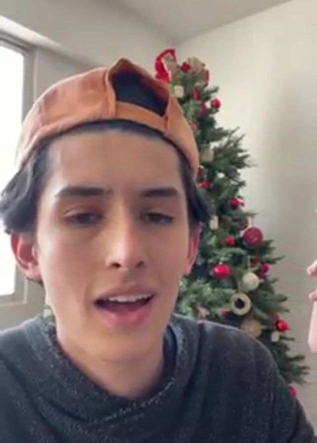 A young man wearing a gray sweater and a tan baseball cap holds a smartphone in front of his face. Behind him is a Christmas tree. The man moves the phone around, showing a dining room with a long, dark wood table. Two young women are seated at the table; there are plates and cutlery on the table. All three people smile and appear to be having a good time. The room is well-lit, and there are paintings on the walls.