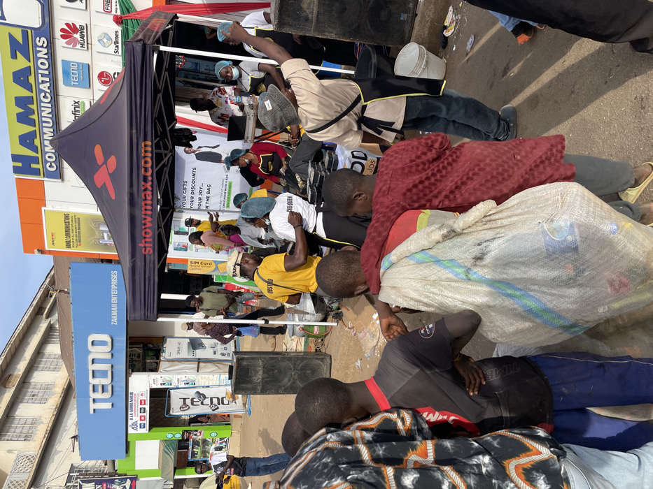 The image depicts a bustling commercial street scene in Jos, Nigeria, focusing on an outdoor promotional event