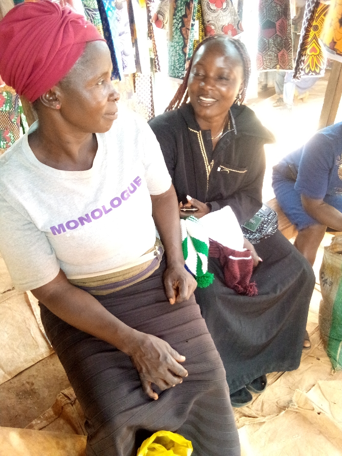 Two women are seated outside with textiles hanging in the background. The woman on the left wears a red headwrap, a grey t-shirt with the word "MONOLOGUE" printed on it, and a dark brown skirt. She looks towards the other woman. The woman on the right has braided hair and wears a black jacket with gold trim. She holds what looks like knitted scarves.