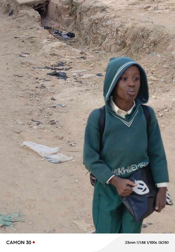 A young person in a green hooded sweater stands on a dirt path strewn with debris. The sweater is a V-neck style, worn over a collared shirt. The person carries a black bag with white designs and has a backpack on. Behind the person, the dirt path leads to what appears to be a drainage ditch and a rough hillside. Litter is scattered across the ground. The person is pouting or pursing their lips.