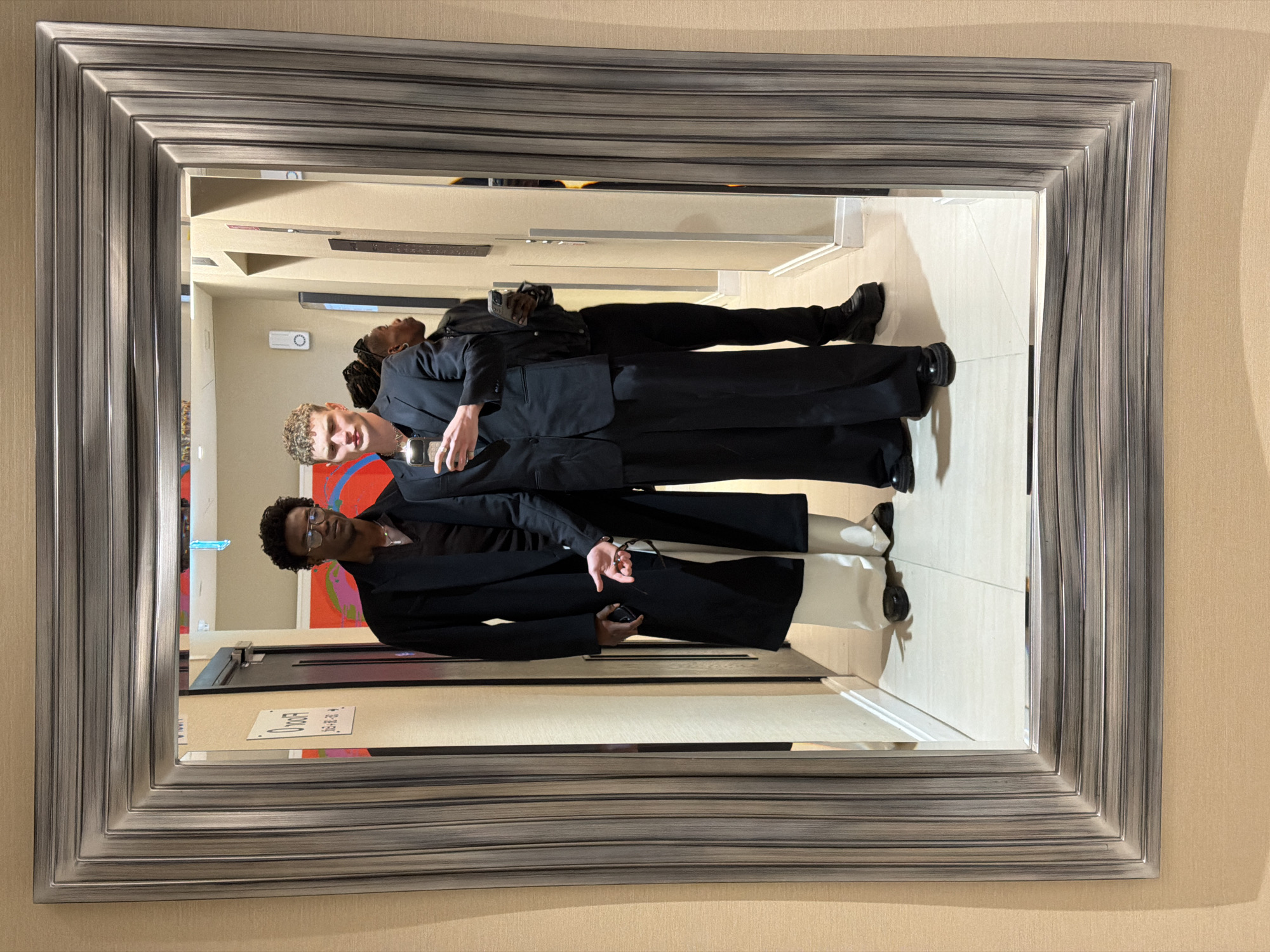 The image depicts a reflection in a large, silver-framed mirror, showing three individuals within a narrow interior hallway of a building in the city of London, United Kingdom. In the foreground, centered, a light-skinned male with short, curly blonde hair wears a black two-piece suit, a black shirt, and black chunky-soled shoes. He holds a silver-colored smartphone in his left hand, aimed towards the mirror, and a pair of dark sunglasses in his extended right hand. A silver necklace is visible on his neck. To his left, a dark-skinned male with short, curly dark hair and clear-rimmed glasses wears a long black overcoat, a black V-neck shirt, wide-leg white trousers, and black shoes. He also wears a silver necklace. His left hand is placed in his coat pocket. Partially obscured to the right of the central figure, a third dark-skinned individual wears a black jacket, dark trousers, and black chunky-soled shoes. They hold a black smartphone in their right hand, looking downwards. The reflected environment reveals light beige textured walls with white baseboards and a light-colored tiled floor. A dark brown door is visible on the left wall, featuring a white sign with "O Floor" printed in black text, accompanied by Asian characters. Further down the hallway, abstract artwork with prominent red and blue hues is visible on the walls, along with a white circular wall-mounted fixture. The central male appears to be taking a photograph of the group's reflection.