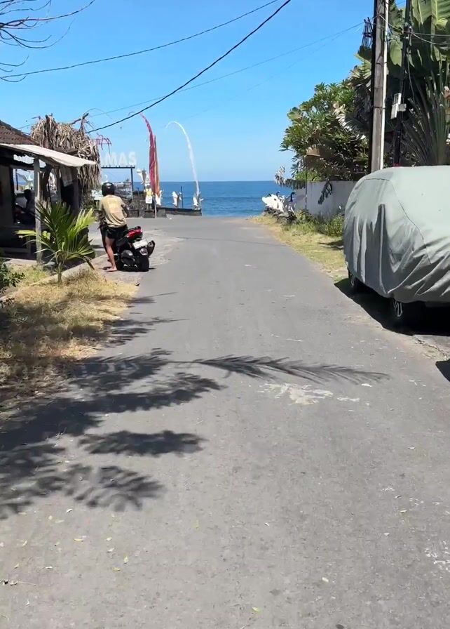 street view of a road leading to a beach. In the foreground, the street has a dark, grey surface, with shadows from trees on the left side. A parked motorcycle is visible on the left, and a silver car under a grey cover sits on the right. Further down the road, a person is standing near a motorcycle, wearing a light-colored t-shirt and shorts. The road leads to the beach, where a sign that says "Pantai Keramas" is visible. Three tall, curved flags flank the sign. Beyond the sign and flags, the blue ocean can be seen under a clear, blue sky. Some vegetation is visible on either side of the road, providing a hint of a tropical environment.