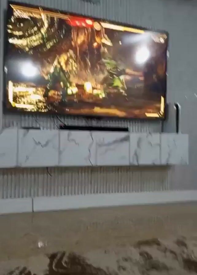 wide shot of a living room with a large television mounted on a wall. The TV is displaying the video game Mortal Kombat, with two characters engaged in a fight. A white console, likely a PlayStation 5, is visible to the right of the TV. Below the TV is a white marble-patterned cabinet. The wall behind the TV has a textured, vertically ribbed design. The floor is covered with a patterned carpet. An audible sound like a child or baby crying can be heard in the background.