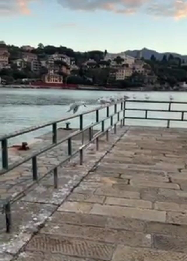 view from a stone pier overlooking a body of water towards a town nestled on a hillside. The pier is constructed of large, weathered stone blocks, and a metal railing runs along its edge. A group of seagulls is perched on the railing at the end of the pier. The water is calm, with gentle ripples visible on the surface. Across the water, buildings are seen on the hillside, appearing to be multi-story structures of varied colors, some with arched windows. The sky is light blue with pink and white clouds. The video is taken at what appears to be either dawn or dusk, as indicated by the soft, diffused light and colors in the sky. The camera angle is static, and there is no audio.