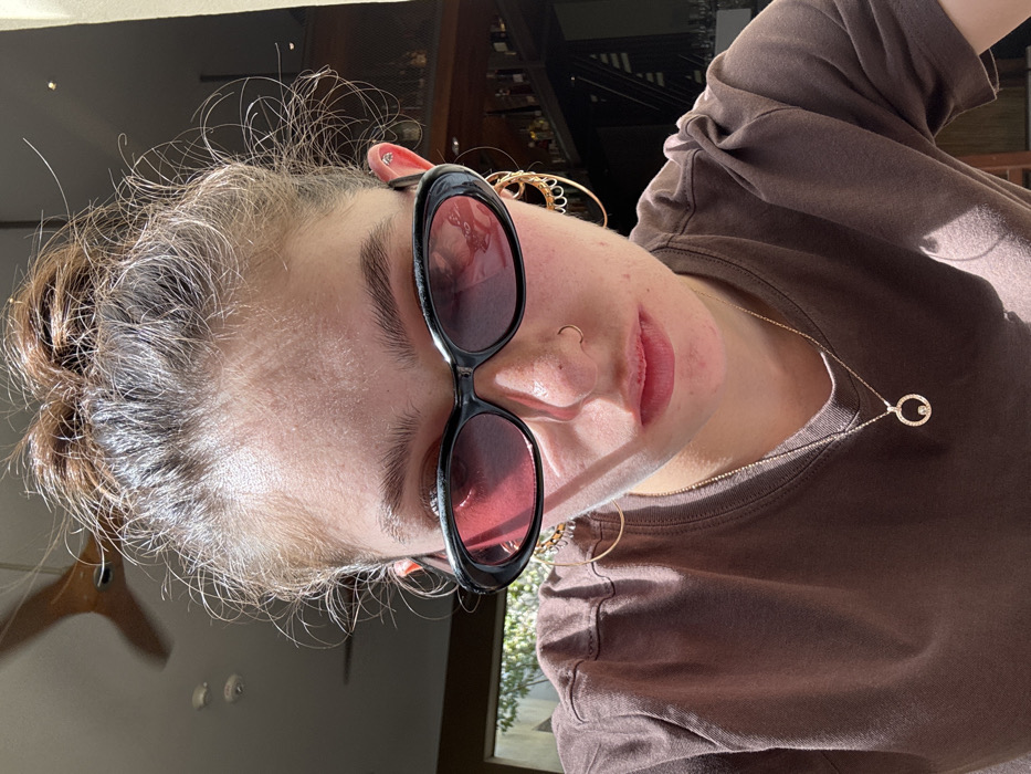 A woman with her hair in a bun wears black-framed sunglasses with red lenses. She has a nose ring and round gold earrings. A gold necklace with a circular pendant is visible against her brown t-shirt. The image is taken at an angle, showing a glimpse of the surroundings. Sunlight creates bright patches on her face and shirt.