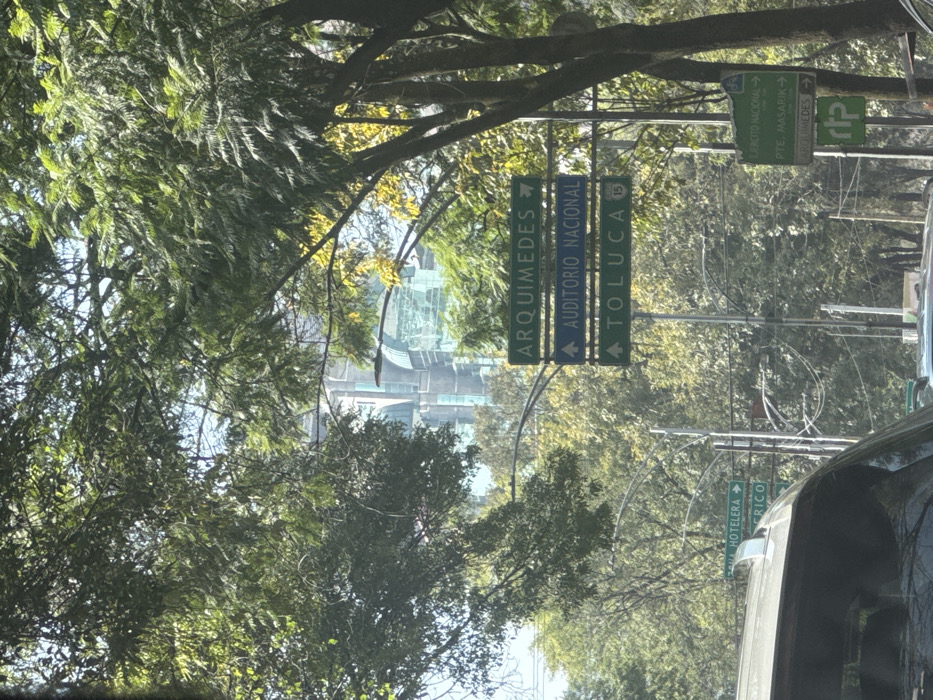 The image presents an urban street scene in Mexico City, specifically in the Polanco area near the Auditorio Nacional. The view is from inside a vehicle, looking forward through the windshield. The foreground is dominated by the upper portion of a silver or light-colored car, including its roof and windshield. Lush green deciduous trees, interspersed with some trees displaying yellow foliage, frame the street, obscuring much of the background. Prominently featured in the mid-ground are multiple green and blue road signs mounted on a metal gantry and poles. Overhead, a stack of three signs reads: "ARQUIMEDES" with a right-pointing arrow, "AUDITORIO NACIONAL" with an upward-pointing arrow, and "TOLUCA MEX 15" with a right-pointing arrow. To the lower right, another green sign indicates directions to "EJERCITO NACIONAL" (right arrow), "PTE. MASARIK" (right arrow), and "ARQUIMEDES," accompanied by an "rtp" logo. A partially visible sign in the lower left shows "HOTELERA" with a right arrow. Through gaps in the tree canopy in the upper background, a modern building with reflective, possibly bluish-green glass surfaces and visible architectural domes or arches can be seen. The scene is illuminated by natural daylight, casting indistinct shadows. No individuals are explicitly visible.
