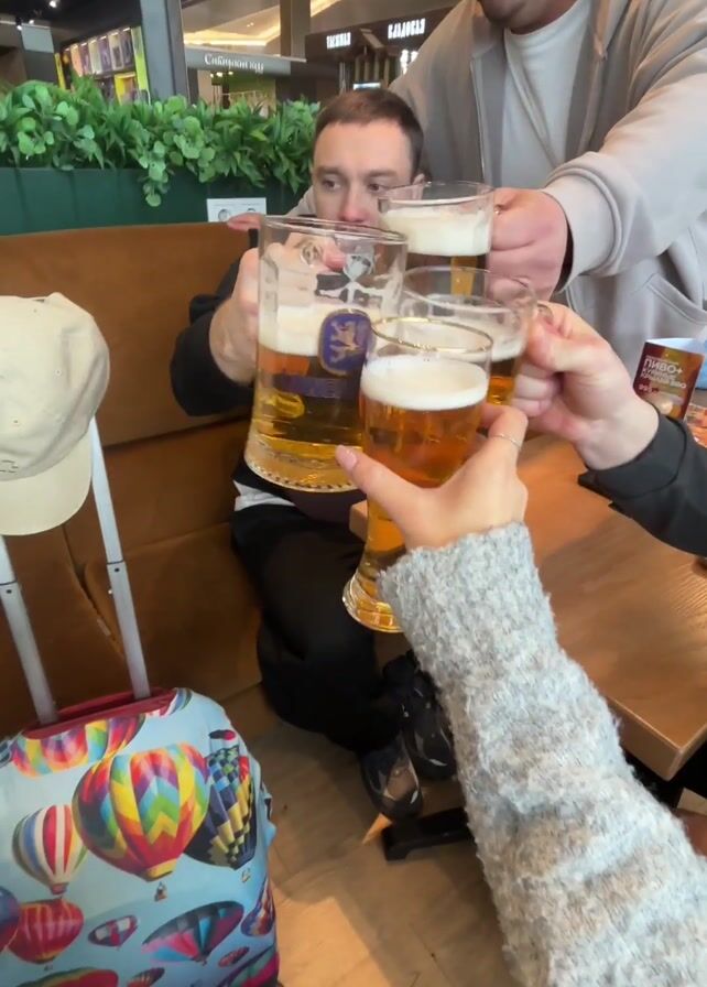 four people toasting with mugs of beer, likely in an airport or similar travel hub. The group is seated around a table, and at least two of them are holding large, heavy mugs. A suitcase with a hot air balloon pattern is visible near the table. The environment appears to be a restaurant or bar area within an airport, with other tables and people visible in the background. There are also signs indicating that there might be toy stores nearby. The lighting is bright, and the general atmosphere suggests a casual, celebratory mood.