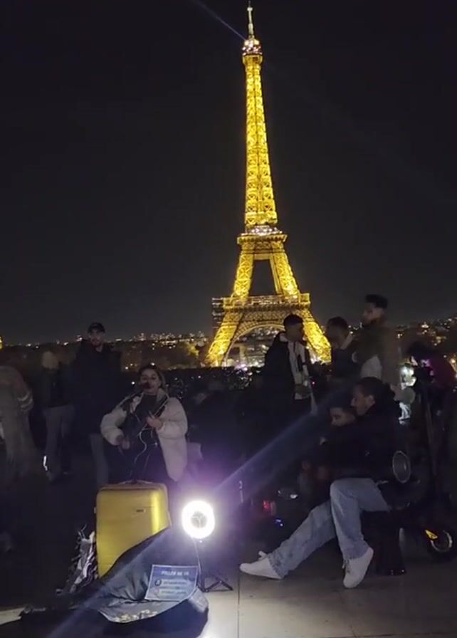 nighttime view of the Eiffel Tower in Paris, France. The tower is brightly lit and stands tall in the background. In the foreground, a group of people is gathered around a female street musician who is playing a guitar and singing. A bright light illuminates the musician and her equipment, which includes a yellow suitcase and a guitar case. The crowd is casually dressed and seems to be enjoying the performance. Some people are sitting, while others are standing. The overall atmosphere is relaxed and festive.
