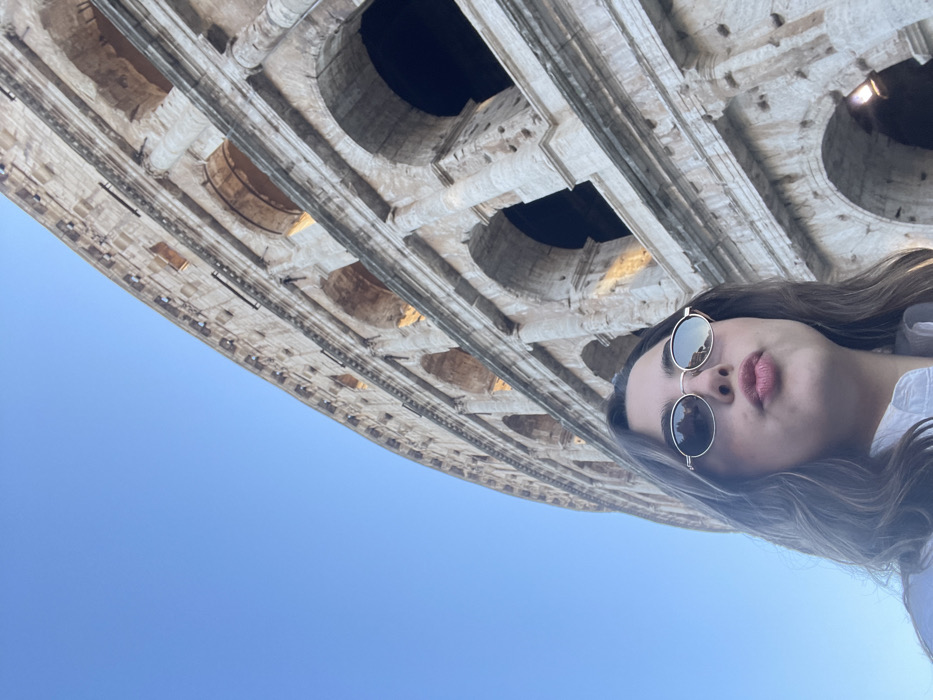 A young female, positioned in the foreground and viewed from a low angle, is centered on the lower-left side of the frame. She has long, wavy brown hair with lighter highlights, worn down, and is wearing oval-framed sunglasses with dark lenses reflecting the sky and surroundings. Her lips are pursed, and she looks slightly upwards and to the right. She is wearing a white collared shirt, visible at the neckline. The background prominently features the ancient Roman Colosseum in Rome, Italy, occupying the right and upper portions of the image. The Colosseum's weathered stone structure, characterized by multiple tiers of arches and columns, is illuminated by golden sunlight, suggesting late afternoon or early evening. The sky above is clear and bright blue.