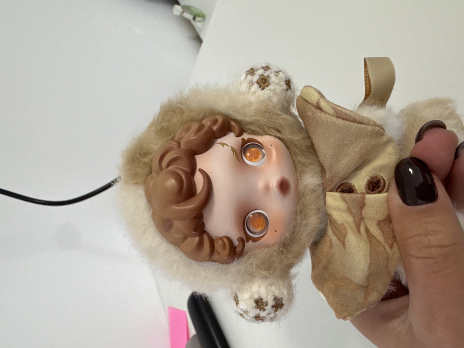 The image displays a close-up of a doll held by a human hand against a plain white background. The doll features a light-skinned face with large, bright orange-amber eyes, small pink lips, and rosy cheeks. Its brown, molded plastic hair is curly, and a small, stylized brown mark is present on its left temple. The doll wears a light brown, fluffy hood that covers its head and neck, with white knitted earflap-like elements on each side featuring light brown star patterns. Below the head, the doll's body is also covered in similar light brown fur-like material, over which it wears a light brown patterned coat or cape with two visible brown buttons. A light brown fabric tag protrudes from the doll's right side. A human hand, with dark brown nail polish, grasps the doll's lower body. In the out-of-focus background, a black cable hangs from above, and various indistinct objects are visible on a white surface: a pink rectangular item and a black object on the left, and a small, light green object on the far right. The image contains no discernible visual elements to identify a specific location within the city of Budva, Montenegro.