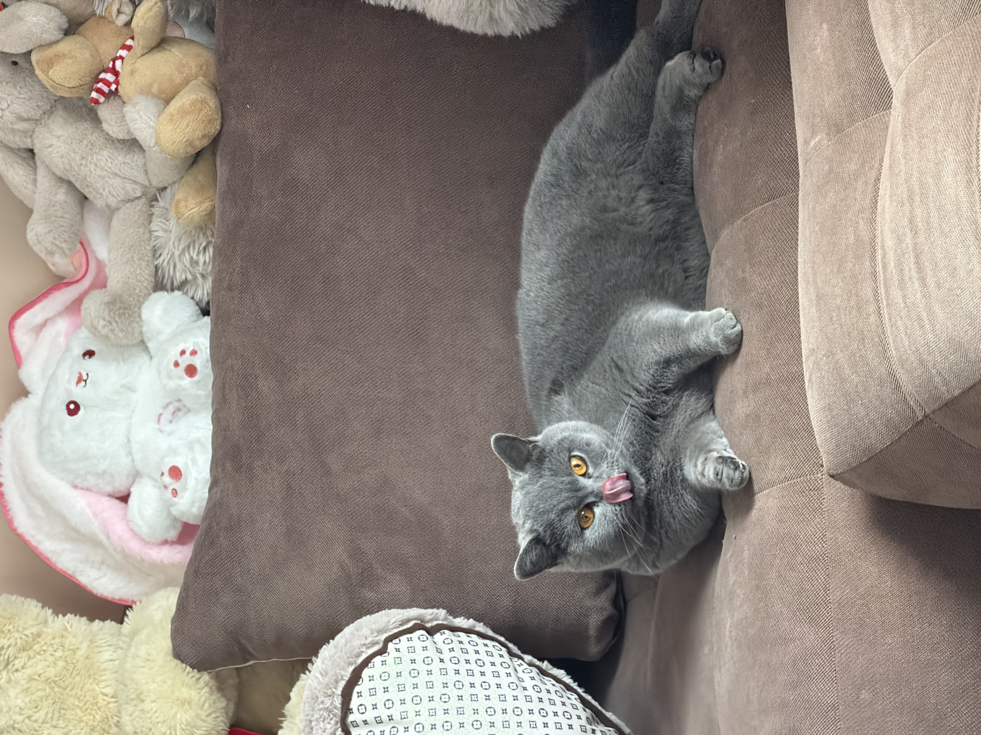 A gray British Shorthair cat is lying on a brown sofa, with its tongue sticking out. The cat has amber eyes and a round face. The sofa is surrounded by stuffed animals, including a white rabbit with pink details. The location is unknown and cannot be derived from the image.