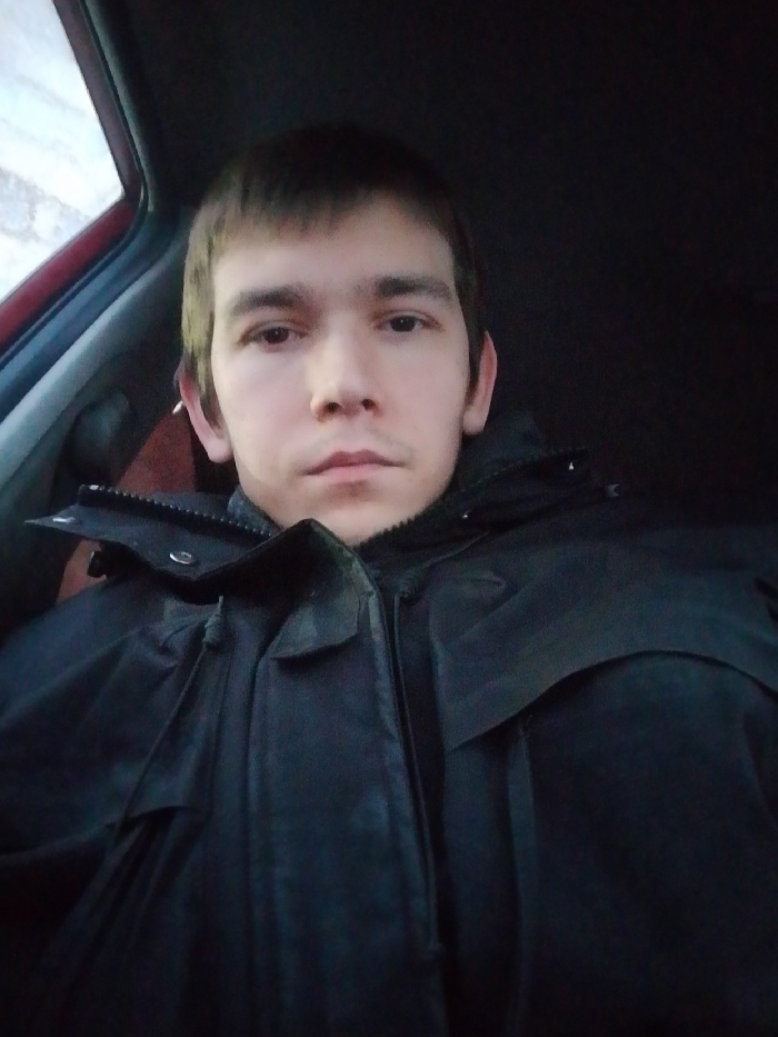 A young man with short brown hair and a light complexion is the focus of the image. He is wearing a dark, possibly black, winter coat with a collar and what appears to be button detailing. The setting seems to be inside a car, with the edge of a red car door visible in the upper left corner and dark shadows surrounding the man, suggesting low light conditions. He gazes directly at the camera.