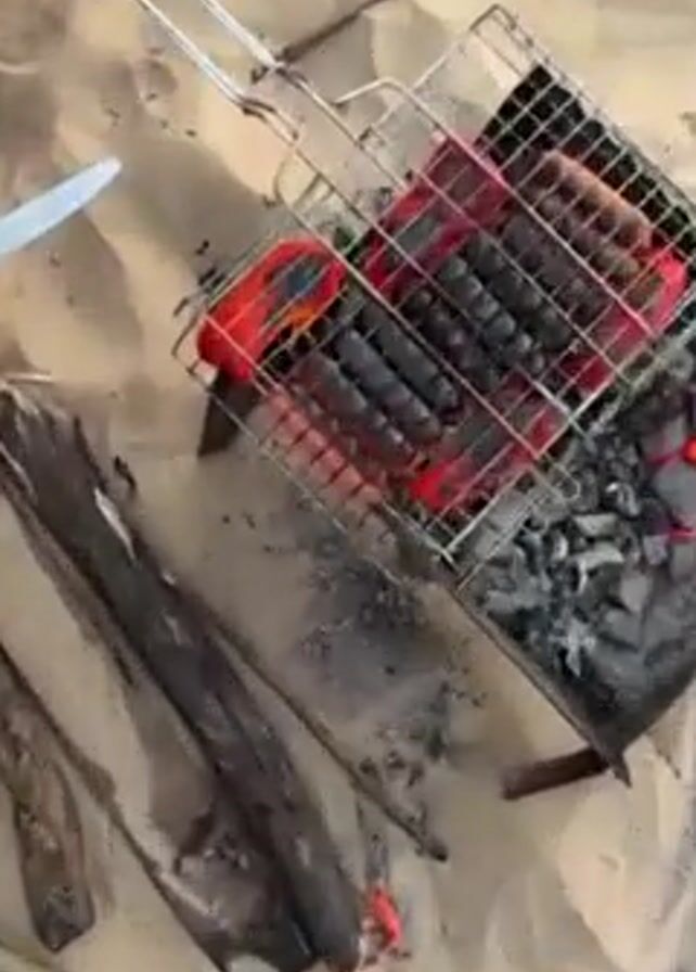 Two people are on a sandy beach. One person, wearing shorts, is squatting to the left of a small, black grill. The other person, wearing striped pants, stands in front of the grill, their feet visible. The grill contains glowing embers and a metal grilling basket filled with rows of what appear to be red peppers and dark sausages that are charred on the outside. Pieces of driftwood are scattered near the grill. The camera zooms in closer to show the food in the grilling basket.