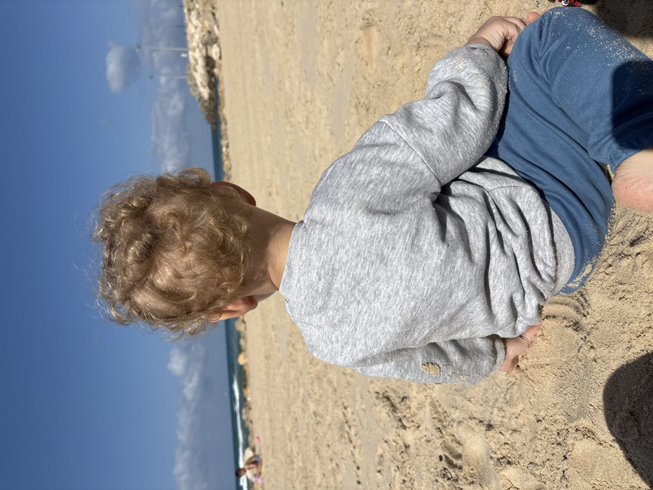 The image displays a sandy beach scene in Ashkelon, Israel, under a clear blue sky with scattered white cumulus clouds. In the foreground, a young child, appearing to be a toddler or preschooler with light brown curly hair, is seated directly on the light brown sand, viewed from behind. The child is wearing a grey long-sleeved sweatshirt and blue long pants; sand is visible adhering to the back of their sweatshirt, sleeves, and bare feet. The child faces forward, looking towards the Mediterranean Sea, where moderate waves are breaking against the shoreline. In the distant left background, another individual is partially visible sitting on the sand near the water's edge. To the right, a man-made rocky breakwater or jetty extends into the sea, featuring at least two light poles positioned on its structure.