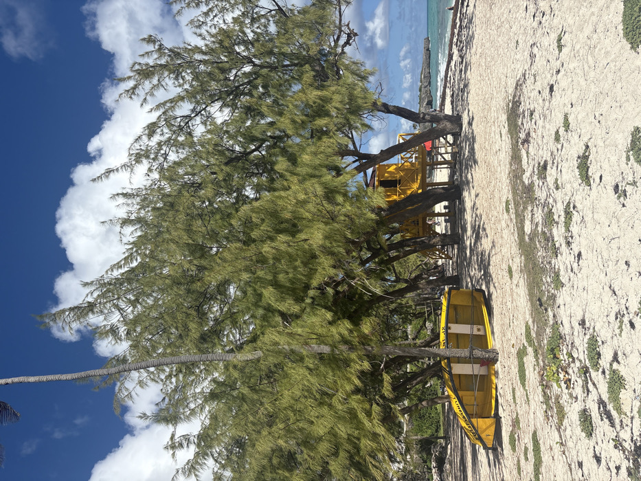 This image captures a daytime coastal scene in Wellhouse, Barbados, under a clear blue sky with scattered white cumulus clouds. The foreground and mid-ground feature numerous trees with dense, light green, needle-like foliage, casting shadows across the sandy terrain. A tall, slender palm tree trunk rises vertically on the far left. In the left-mid foreground, a yellow boat rests inverted on the sand, revealing white structural elements on its underside. Partial text, "ST. CLEMENT," is visible on the hull. To the right and slightly further back, a two-story yellow wooden lifeguard tower stands elevated on stilts, partially obscured by tree trunks. A red object is visible directly beneath the tower. The sandy ground is light-colored, interspersed with sparse patches of green vegetation and dark organic debris. In the background, the turquoise ocean extends to the right, meeting a distant landmass. Small, indistinct human figures are visible near the distant waterline, with one appearing to be in the water to the right of the yellow tower.