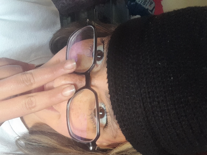 A close-up photograph, taken in an indoor setting within Meknes, Morocco, depicts an individual, likely female, from the chest up. The subject wears a black knitted beanie covering the forehead and a plain white t-shirt. Dark-framed eyeglasses are worn, and her dark brown eyes are open, looking directly towards the viewer. Her skin tone is medium, and light brown highlights are visible in her hair near the right temple. The fingers of her right hand are positioned over the bridge of her nose and the lower part of her face, obscuring the mouth area. Her fingernails are natural and unpainted. The background is out of focus and dark, revealing indistinct elements such as reddish and blue fabrics, consistent with a cluttered room.