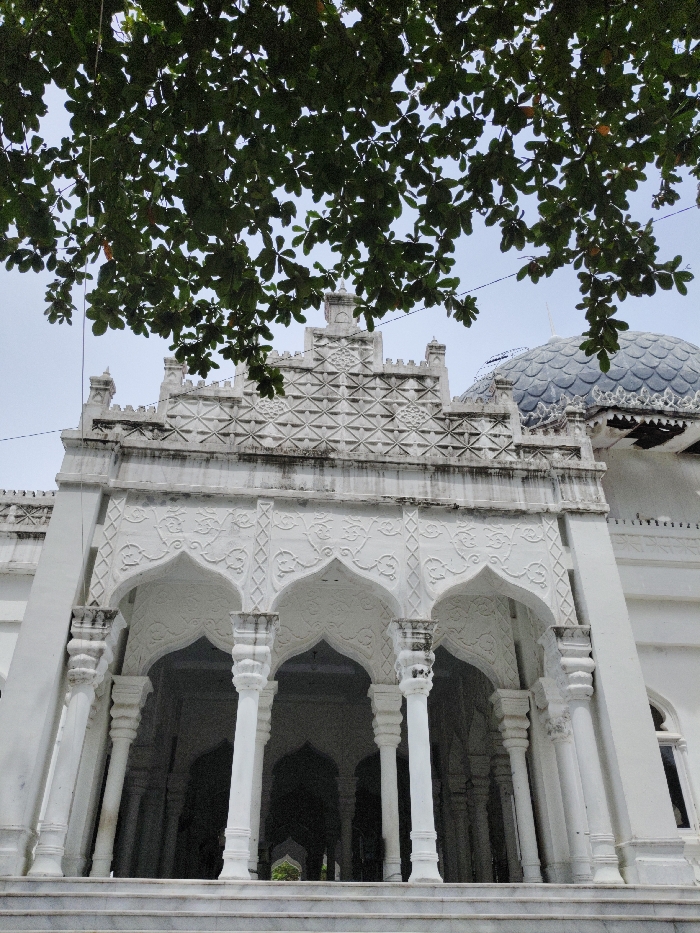 The image displays an upward-angled view of an intricately detailed, white-colored building, confirmed to be located in the city of Cut, Indonesia. The central element is a prominent entrance portico featuring multiple pointed arches. Three arches are clearly visible, supported by robust, white columns characterized by segmented or ribbed designs. The spandrels and soffits of these arches are adorned with elaborate relief carvings, incorporating both curvilinear and geometric patterns. Above the arches, a decorative frieze exhibits a consistent diamond-grid motif, topped by small, ornate finials and a crenellated parapet. A section of a large, dark, textured dome, appearing scaled or tiled, is partially visible on the upper right side of the structure. A flight of white marble steps leads up to the portico. The upper portion of the frame is filled with the dense, green foliage of a large tree, providing a natural foreground against a light blue or overcast sky. There are no individuals, actions, or interactions depicted within the scene.