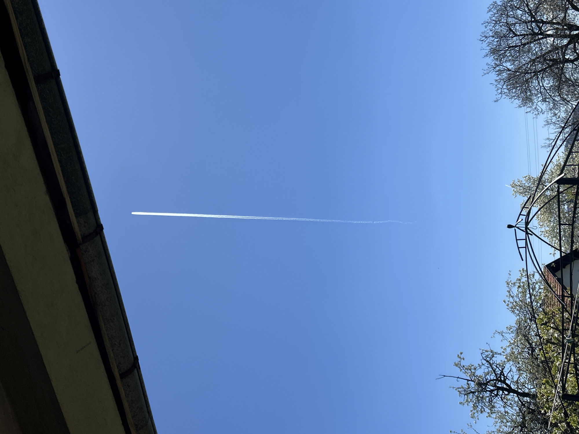 The image is a low-angle shot of the sky in Milanovo, Bulgaria. A bright blue sky dominates the frame. A contrail from a high-altitude aircraft stretches horizontally across the sky. In the lower left of the frame, a portion of a building roof is visible, with gutters. In the lower right, a decorative metal structure with flowering trees is present. The scene depicts a clear day with signs of human activity (aircraft) and both natural (trees) and built (building) environments.