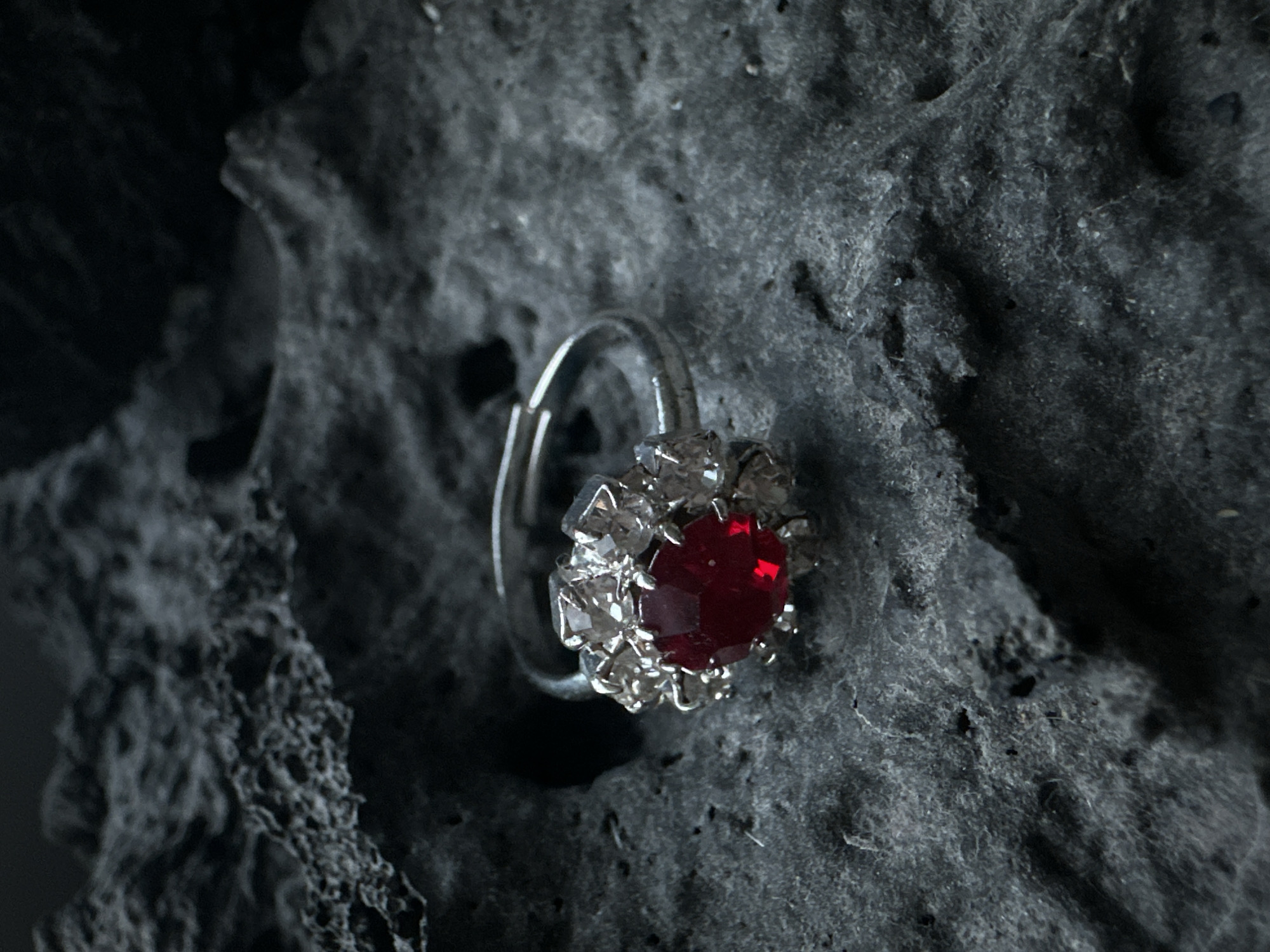 A silver ring with a large, faceted red stone surrounded by clear, smaller stones sits on a rough, dark gray, porous surface resembling rock or volcanic material