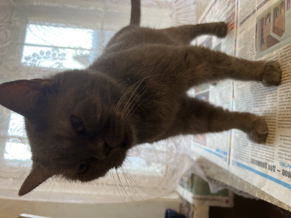 - "A dark grey cat stands on a flat surface covered with multiple sheets of Russian-language newspaper, with visible Cyrillic text including "для дошкольников" (for preschoolers)" by FM-Jh9B72, licensed under CC BY 4.0
