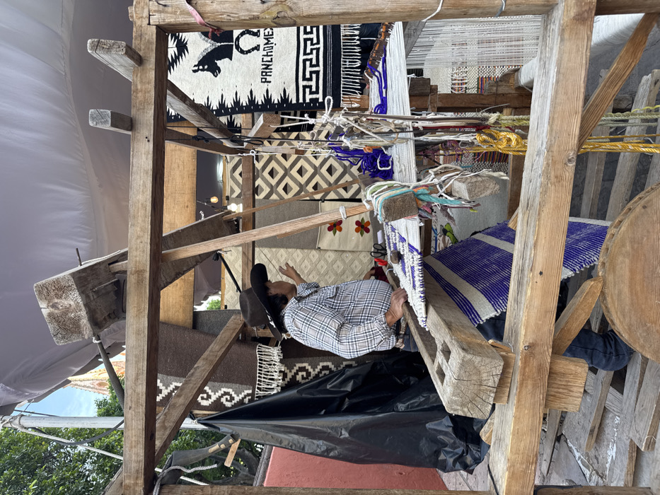 A man in a plaid shirt and black hat stands amid a wooden structure. Tapestries hang in the background, showcasing diverse patterns including geometric designs, floral motifs, and animal figures. A loom is visible, bearing a partially woven rug with blue and white stripes. Additional woven goods and materials are strewn around, suggesting a marketplace stall.
