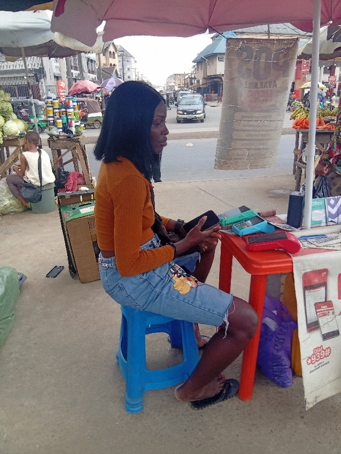 This image depicts an outdoor market scene in Ura Nta Umuarandu, Nigeria, under bright daylight. In the foreground, a dark-skinned woman with straight black hair is seated on a blue plastic stool. She wears an orange long-sleeved crop top and distressed light blue denim shorts with cartoon-like patches on the left thigh. Her feet, one bare and the other wearing a black flip-flop, rest on the ground. She holds a dark smartphone with both hands, looking slightly to her right. Immediately in front of her is a small red plastic table holding multiple electronic point-of-sale (POS) machines in blue, red, and green, along with a black rectangular device and a white paper flyer with "Airtel" branding. A white advertising banner, partially visible and displaying "POS AVAILABLE," hangs behind the table to the right. A purple bag rests on the ground under the table. To the woman's left, a cardboard box and a black smartphone are on the concrete ground next to a large green bag. In the mid-ground to the left, a market stall features a large pile of green cabbages. Another individual, light-skinned and wearing a white sleeveless top, is seated on a green object near the cabbages, appearing to sort produce. Behind them, a wooden stand displays numerous stacked jars or tins. The background shows a paved street with ongoing traffic, including a dark SUV moving away from the viewer. Buildings of varying heights line both sides of the street. Overhead, large pink and white market umbrellas provide shade to the stalls and individuals.