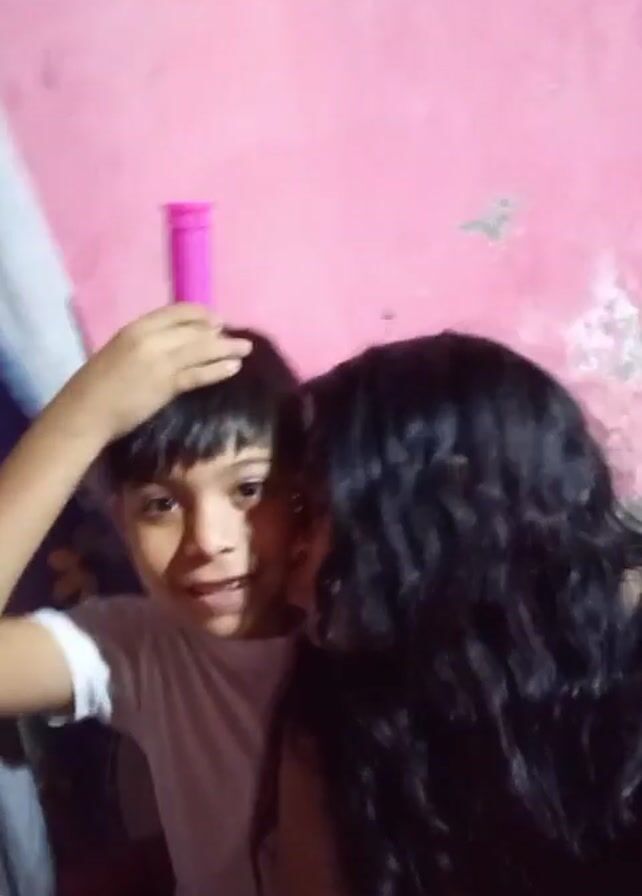 A child with short, dark hair is standing slightly behind a woman with long, dark curly hair who is wearing glasses. The child is holding a pink object over their head and is looking directly at the camera. The woman is looking slightly off to the side and smiling. The child then kisses the woman on the cheek. They appear to be inside a room with a pink wall. There is a white curtain visible on the left side of the frame.