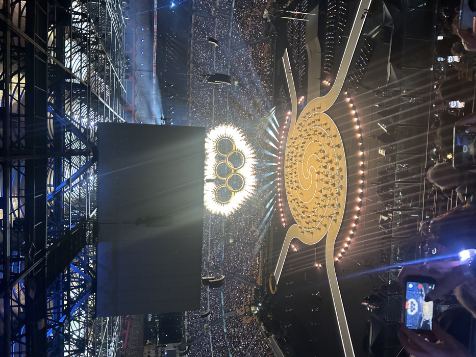 A stadium filled with people is seen from above. At center is a spiral platform populated with people. Adjacent to it are five rings, the Olympic symbol, surrounded by bright sparks. Steel structure frames the left side of the view. Attendees hold up phones, capturing the spectacle. The overall scene suggests a large-scale event, possibly a performance or ceremony.