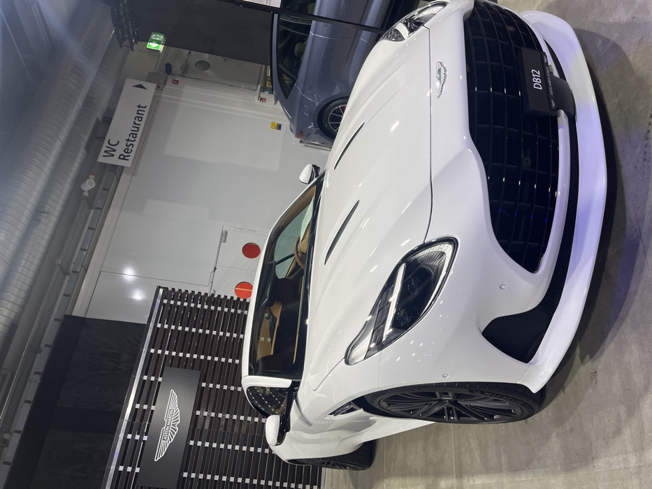 An indoor scene depicts a white Aston Martin DB12 sports coupe prominently displayed, angled slightly towards the viewer's left