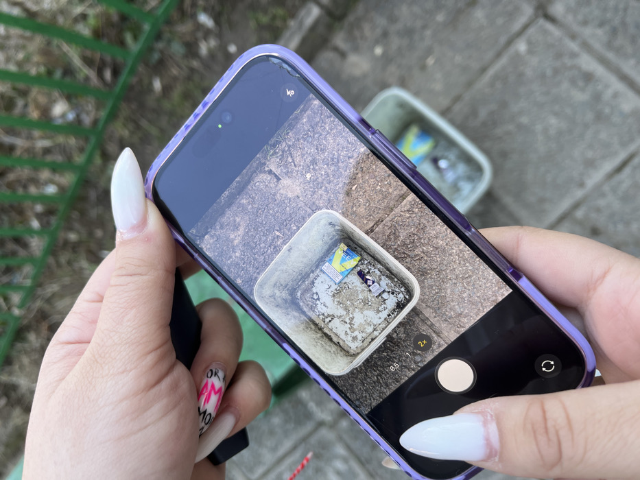 An individual's hands are observed holding a smartphone in an outdoor setting in Cherven Bryag, Bulgaria. The subject's left hand, featuring long, white, manicured fingernails with a pink and black design on the index finger, grips the phone. The smartphone, enclosed in a purple case, displays its camera interface, actively capturing an image. The phone's screen shows a live view of a square, light-gray plastic bin positioned on gray interlocking pavers. Inside this bin, various pieces of debris are visible, including a distinct blue and yellow cigarette packet and dark fragments. In the background, another similar light-gray bin, partially obscured and out of focus, contains additional debris, including another blue and yellow item. A green metal fence is discernible in the upper background, separating the paved area from an indeterminate space beyond. The ground surface consists of gray interlocking pavers.
